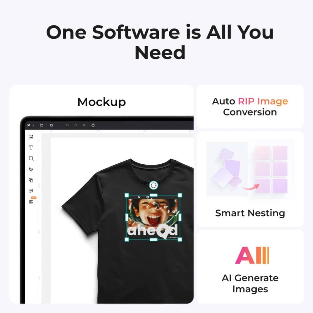 - Dual Epson I1600 printheads are used, which work together – one applies colour and the other white ink on dark fabric.